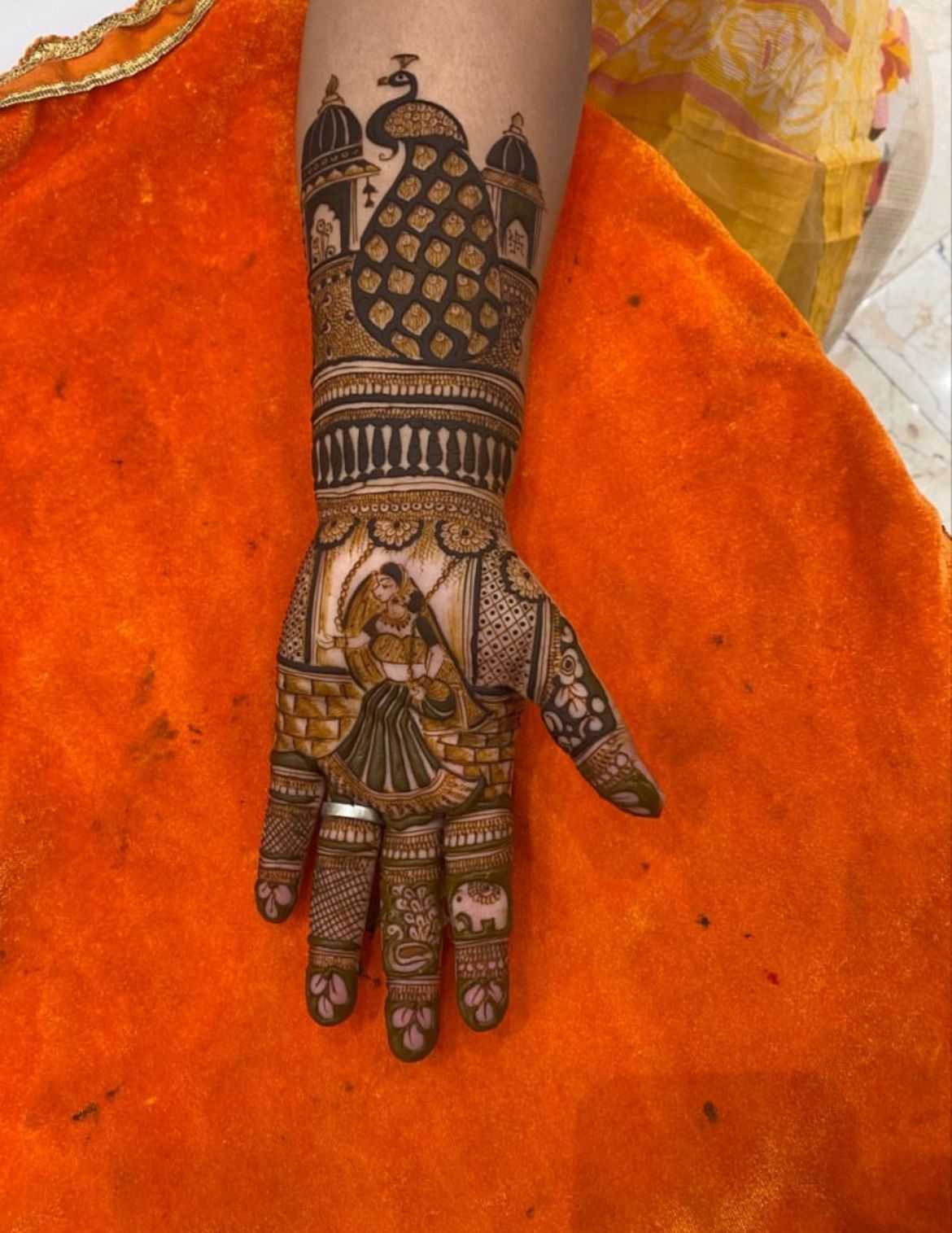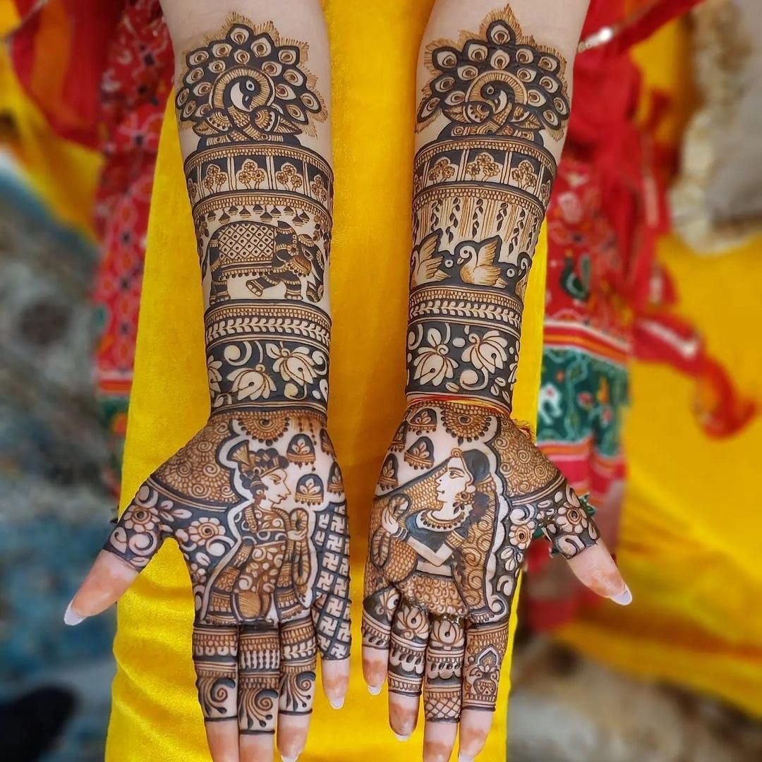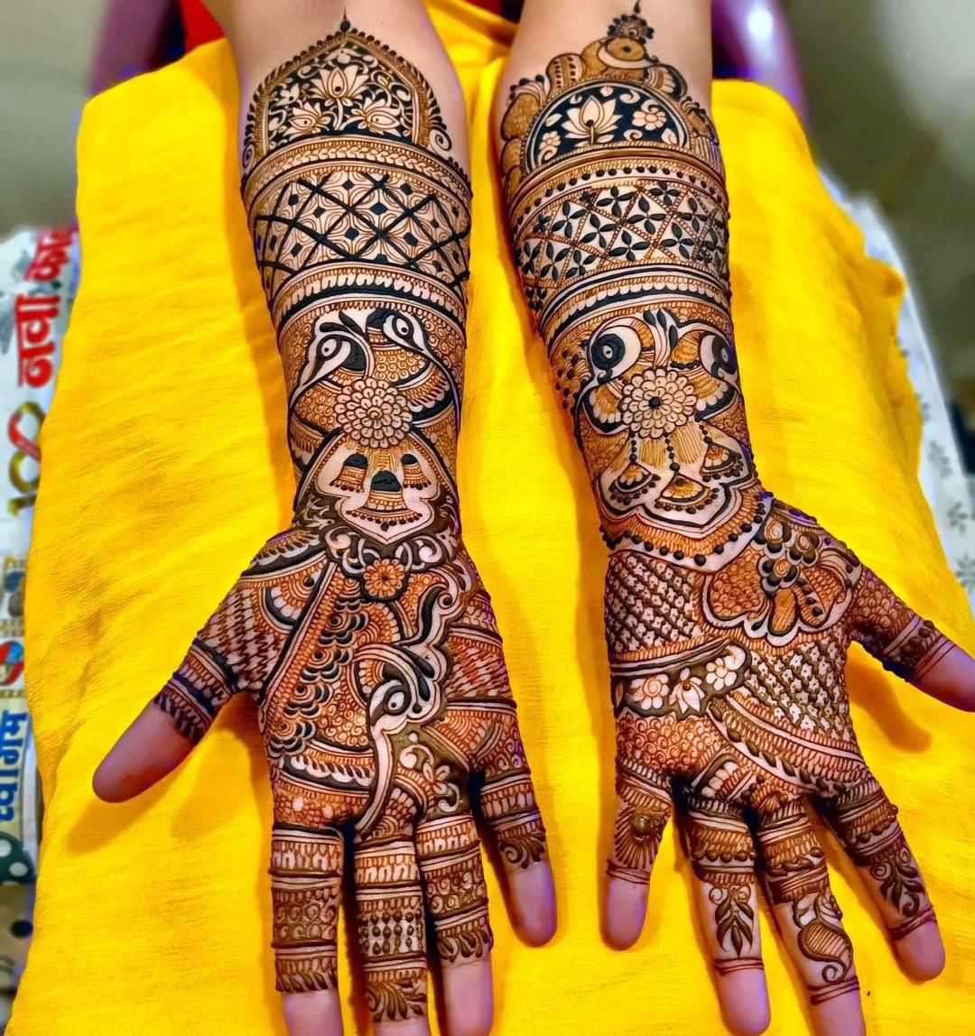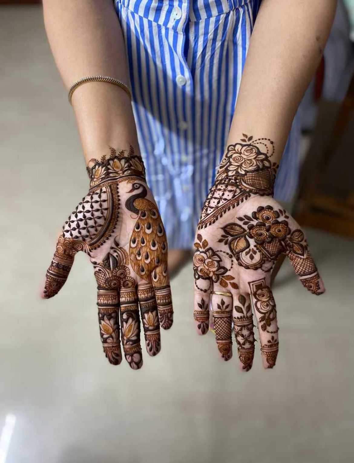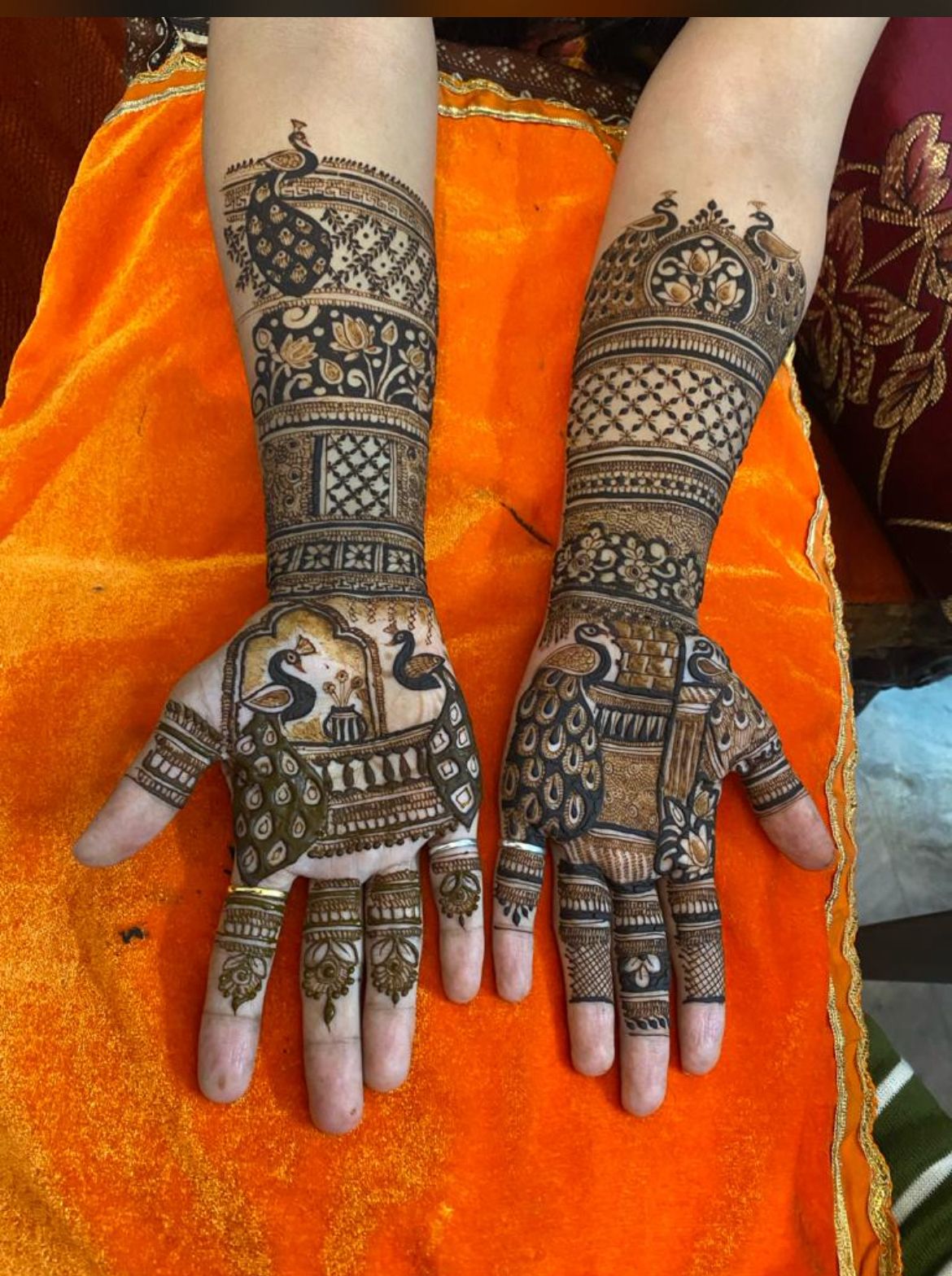 This traditional Rajasthani / Marwari-style mehndi features intricate patterns, often with peacocks and royal motifs — a popular choice for brides aiming for a regal, cultural look.