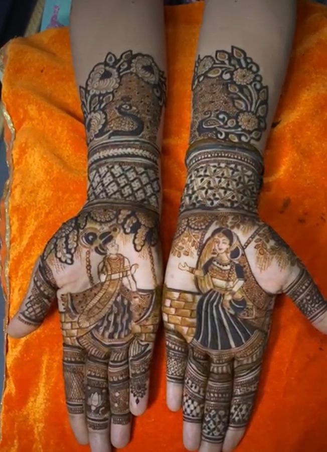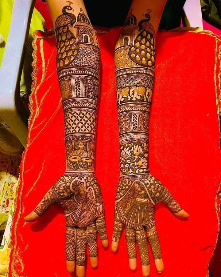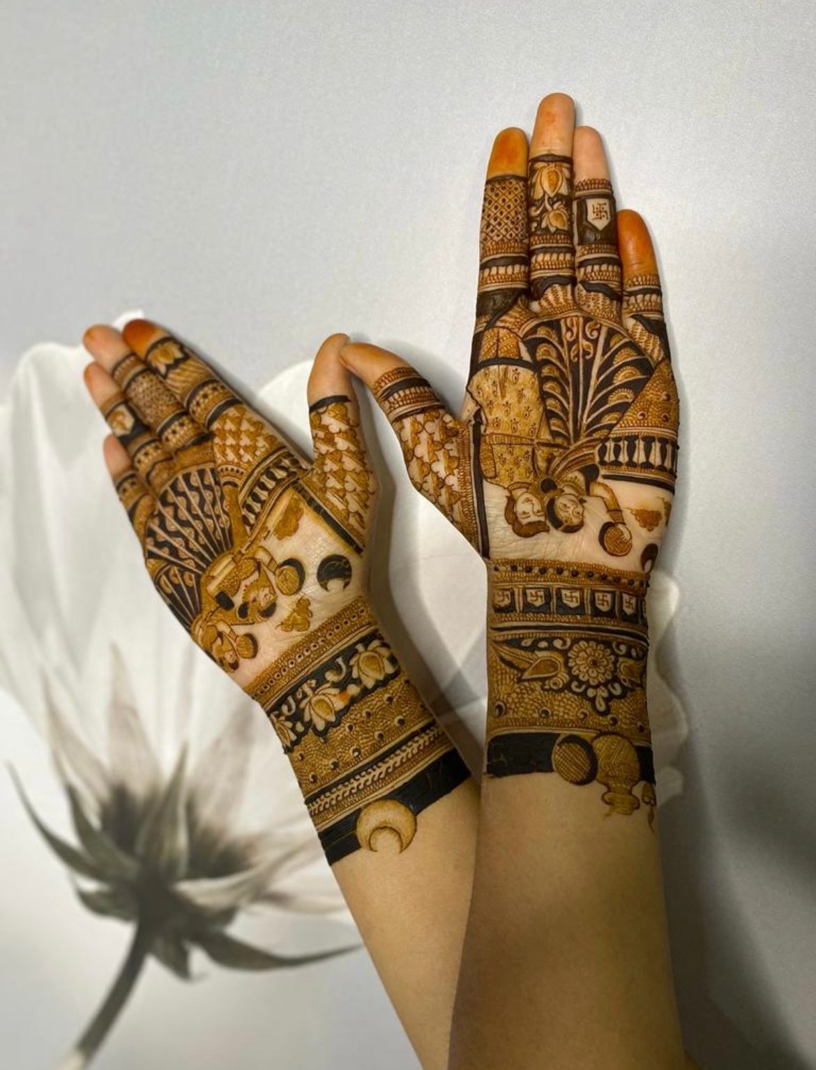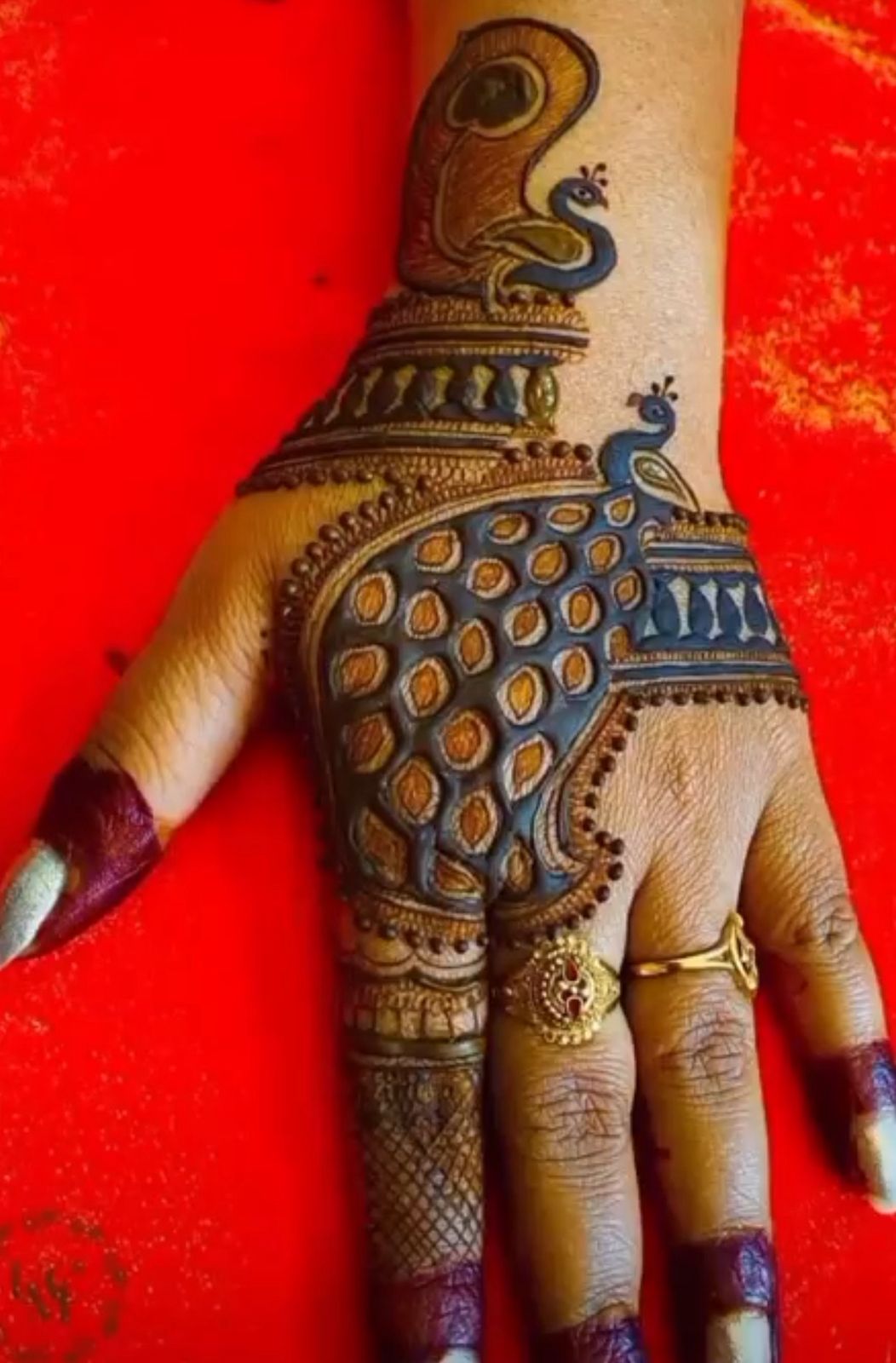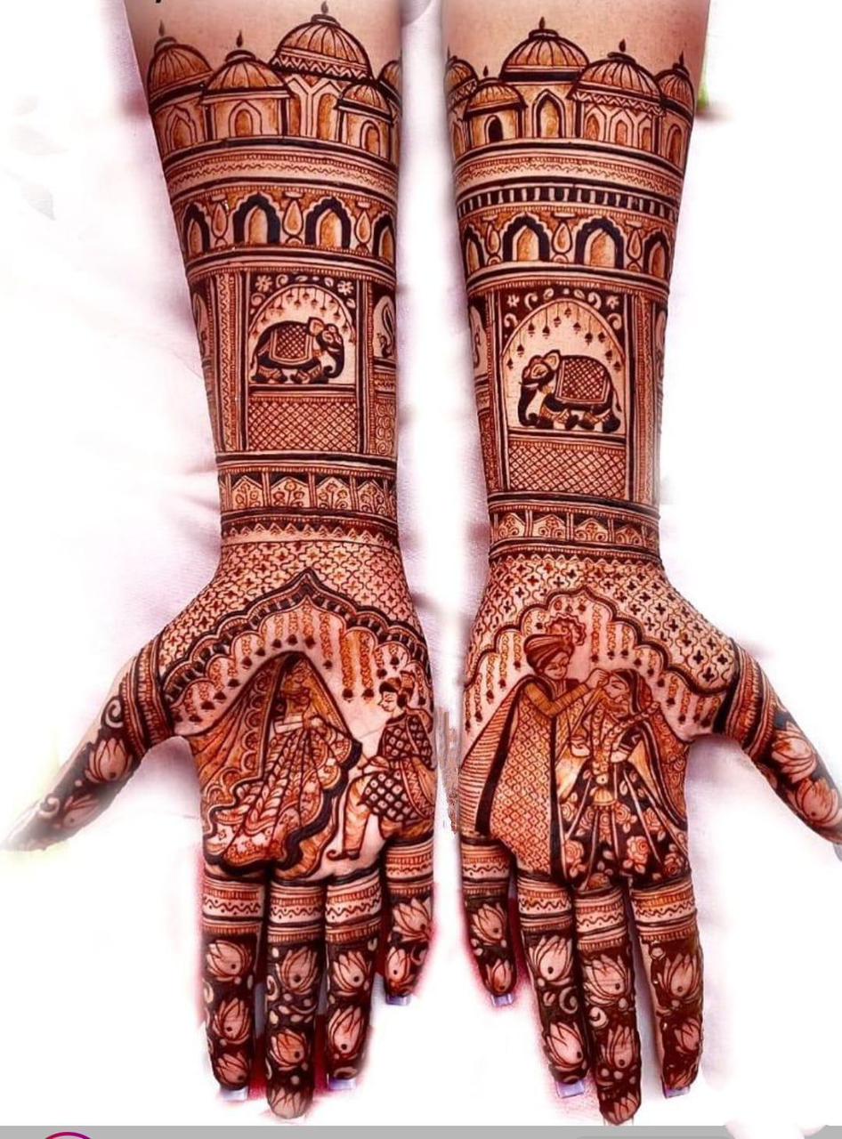 This traditional Rajasthani / Marwari-style mehndi features intricate patterns, often with peacocks and royal motifs — a popular choice for brides aiming for a regal, cultural look.
