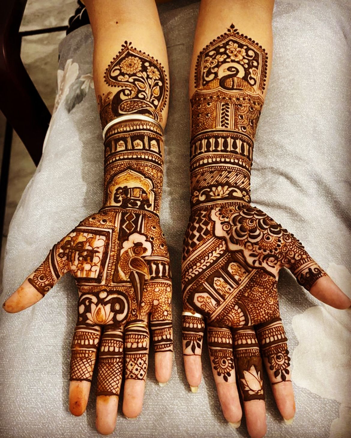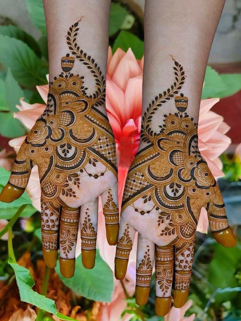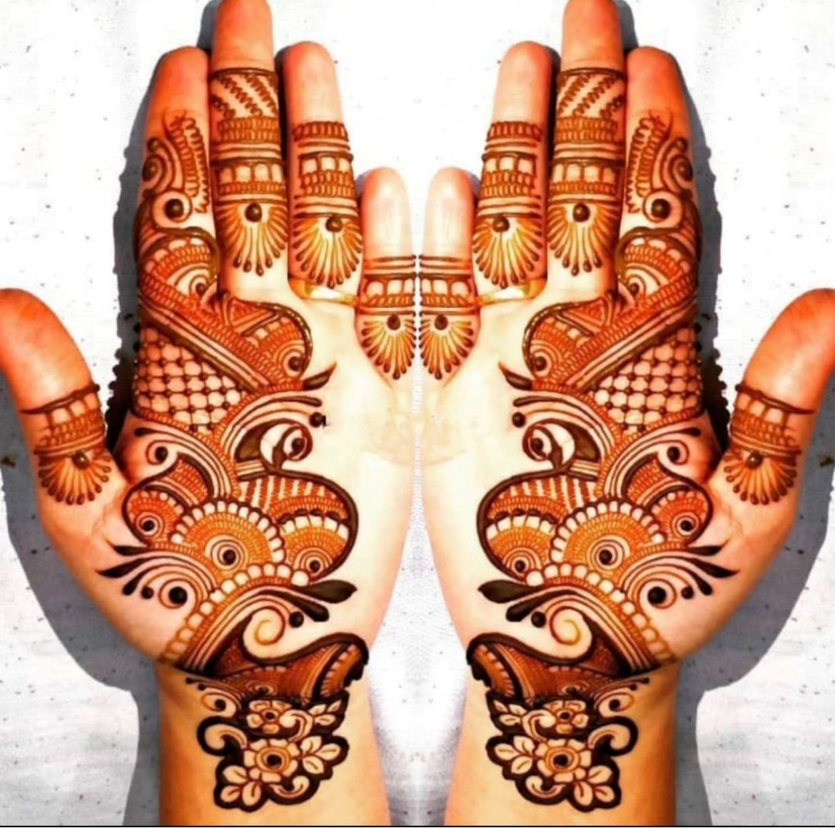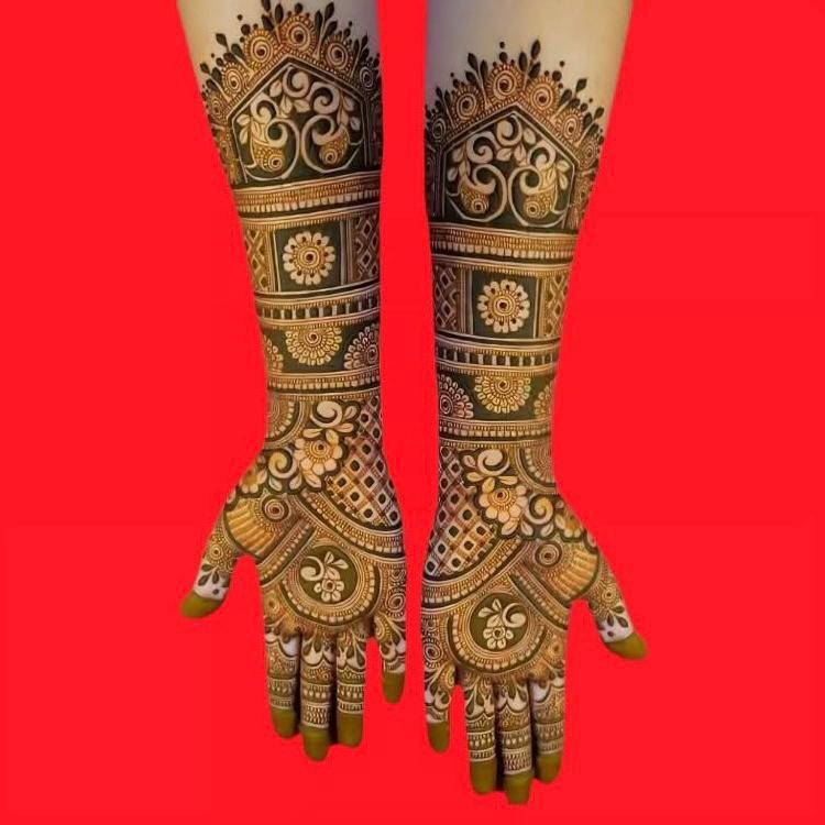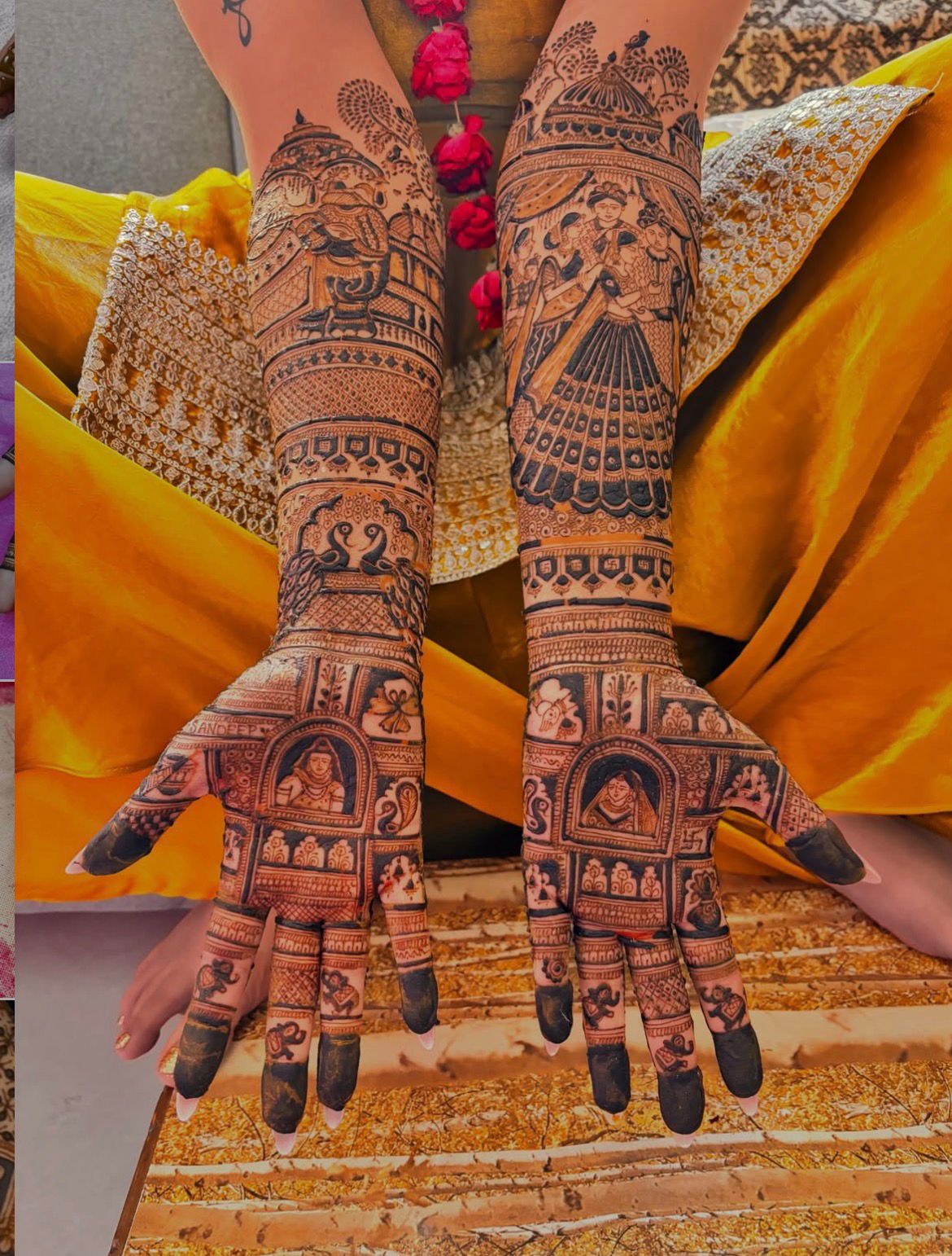 This traditional Rajasthani / Marwari-style mehndi features intricate patterns, often with peacocks and royal motifs — a popular choice for brides aiming for a regal, cultural look.