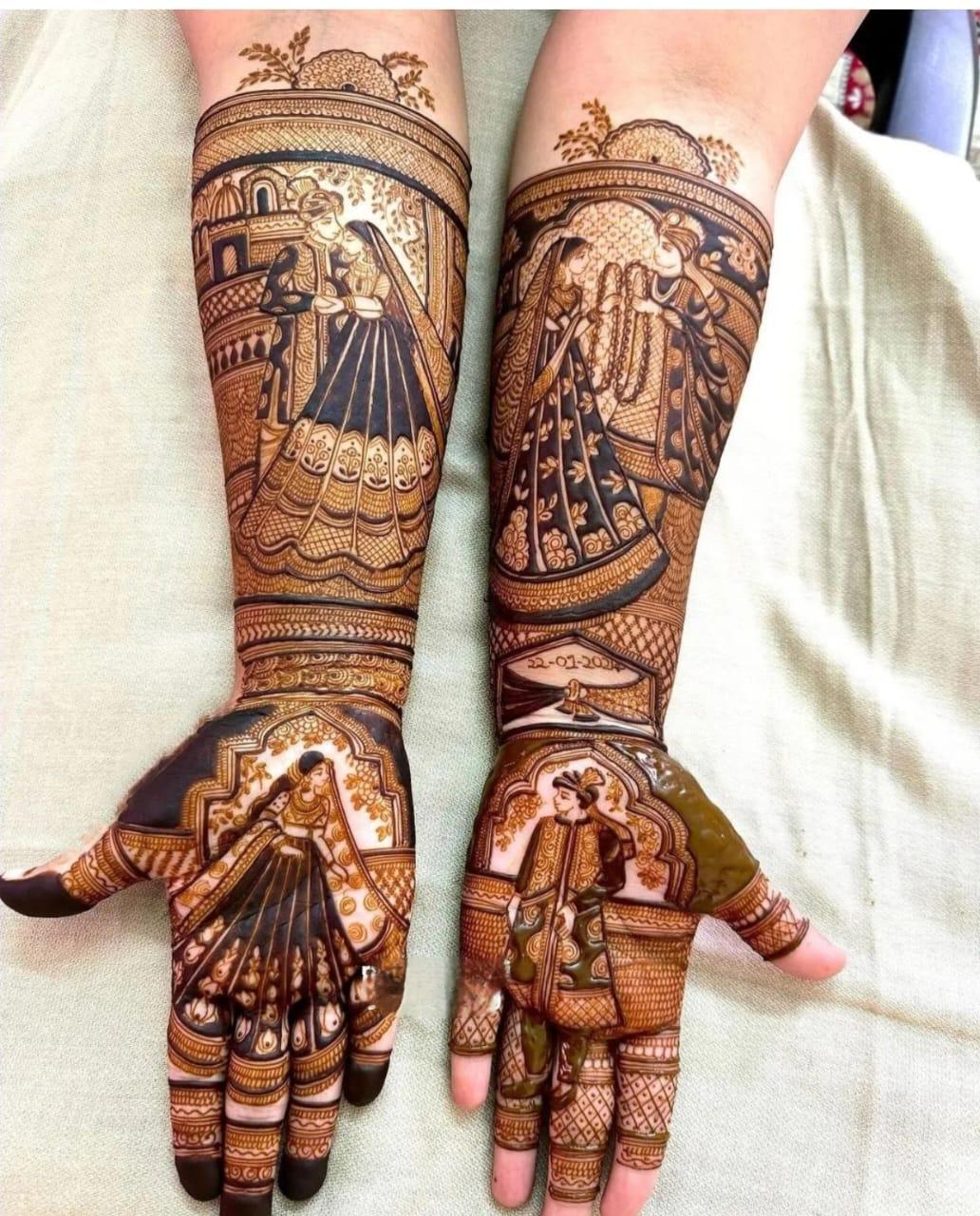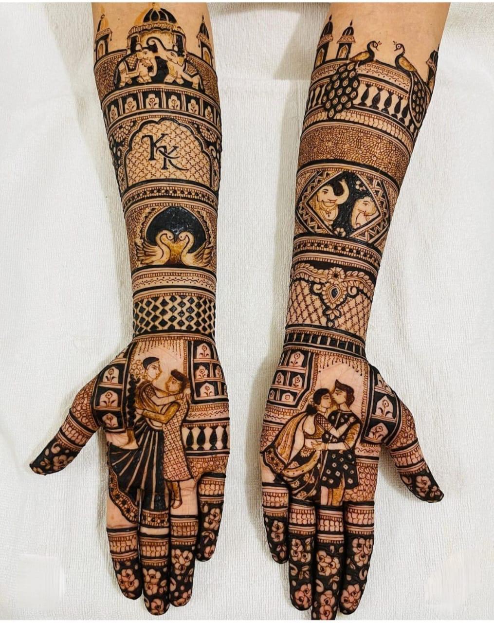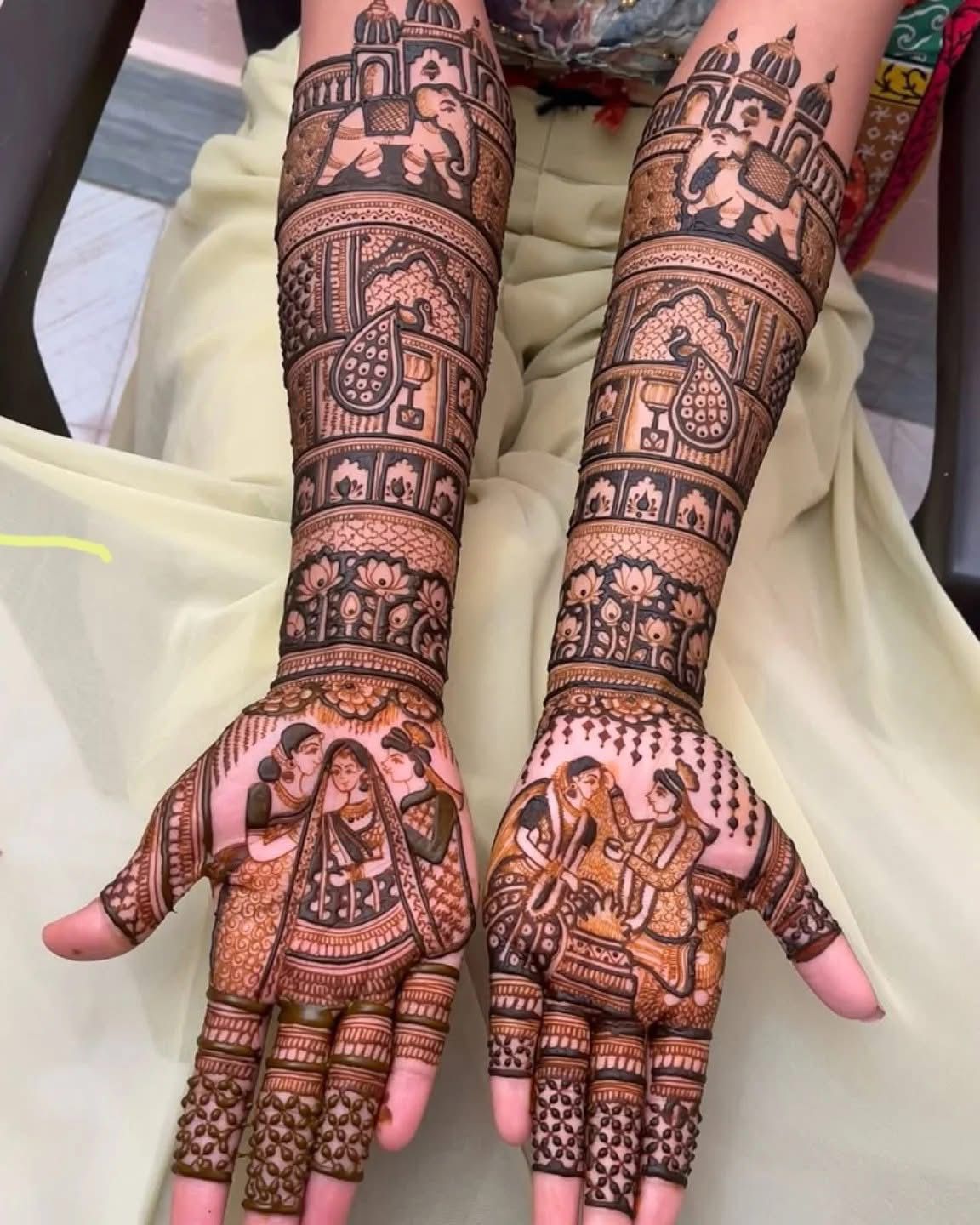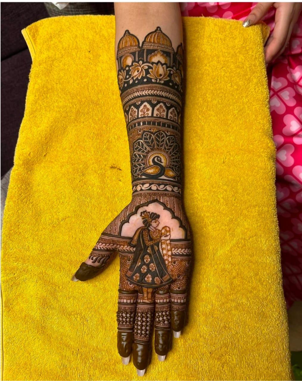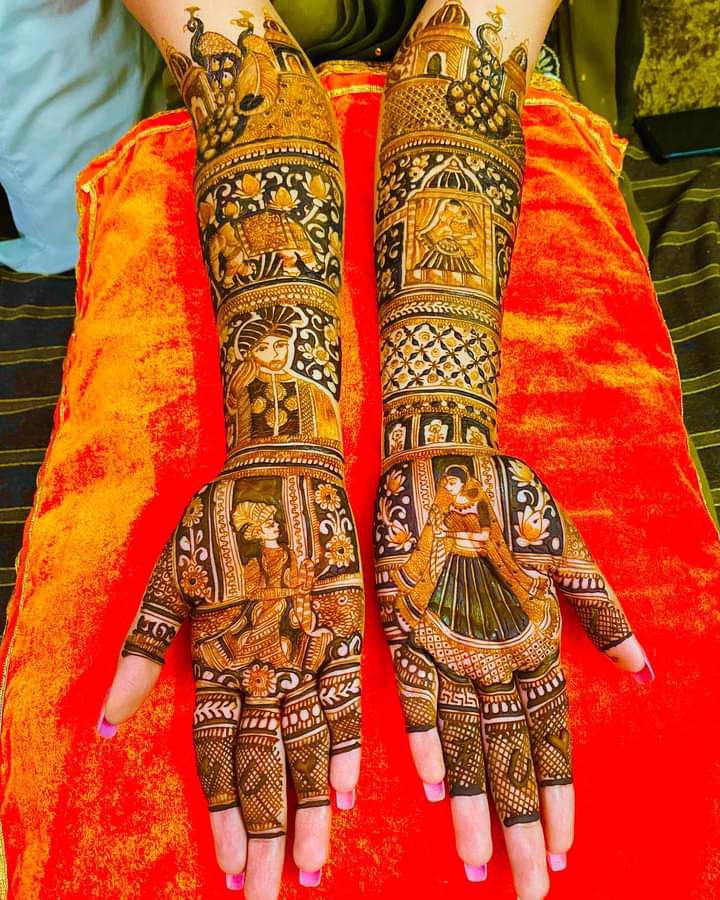 This traditional Rajasthani / Marwari-style mehndi features intricate patterns, often with peacocks and royal motifs — a popular choice for brides aiming for a regal, cultural look.