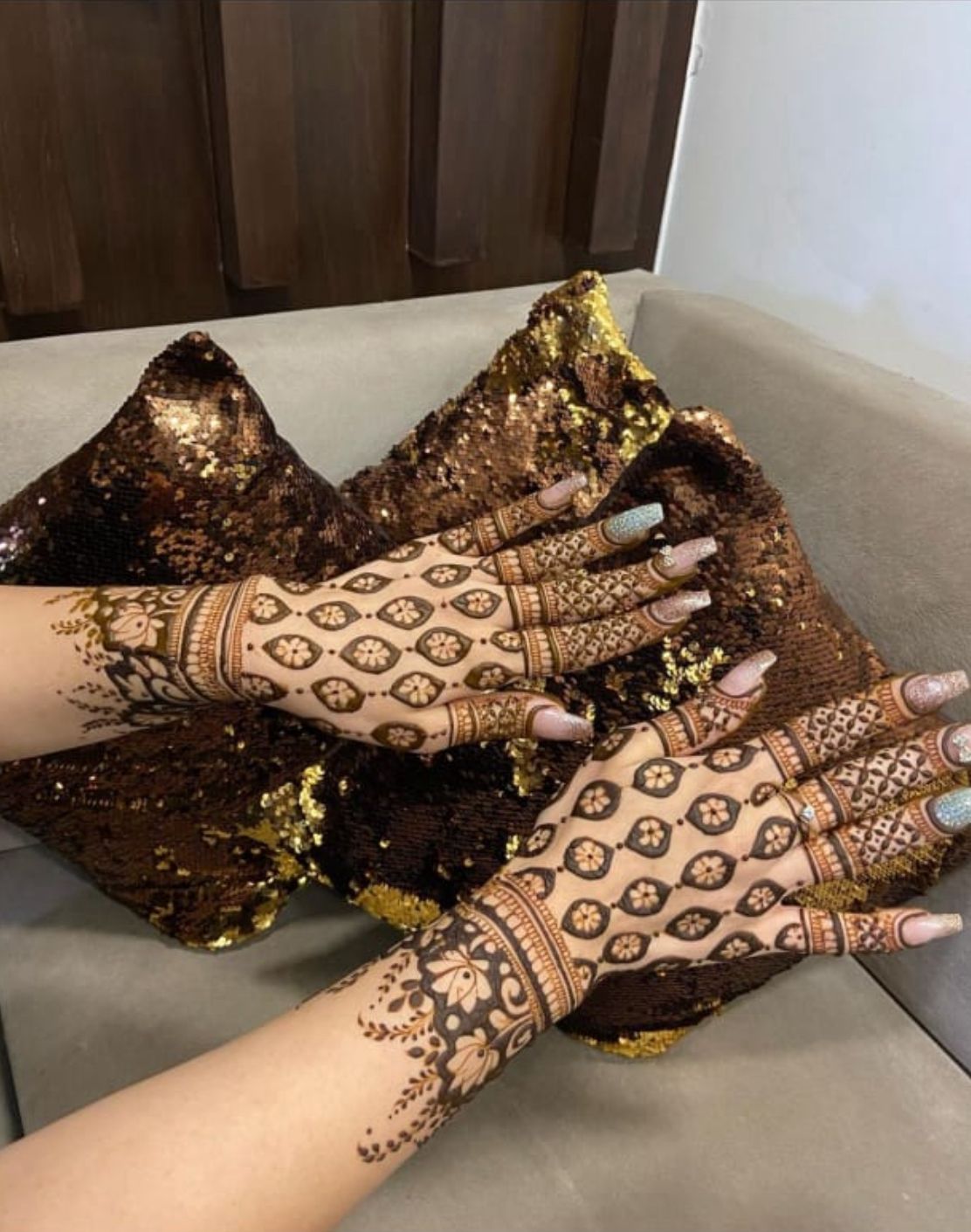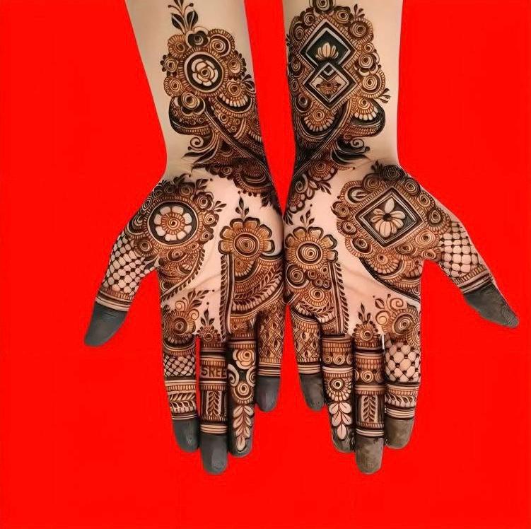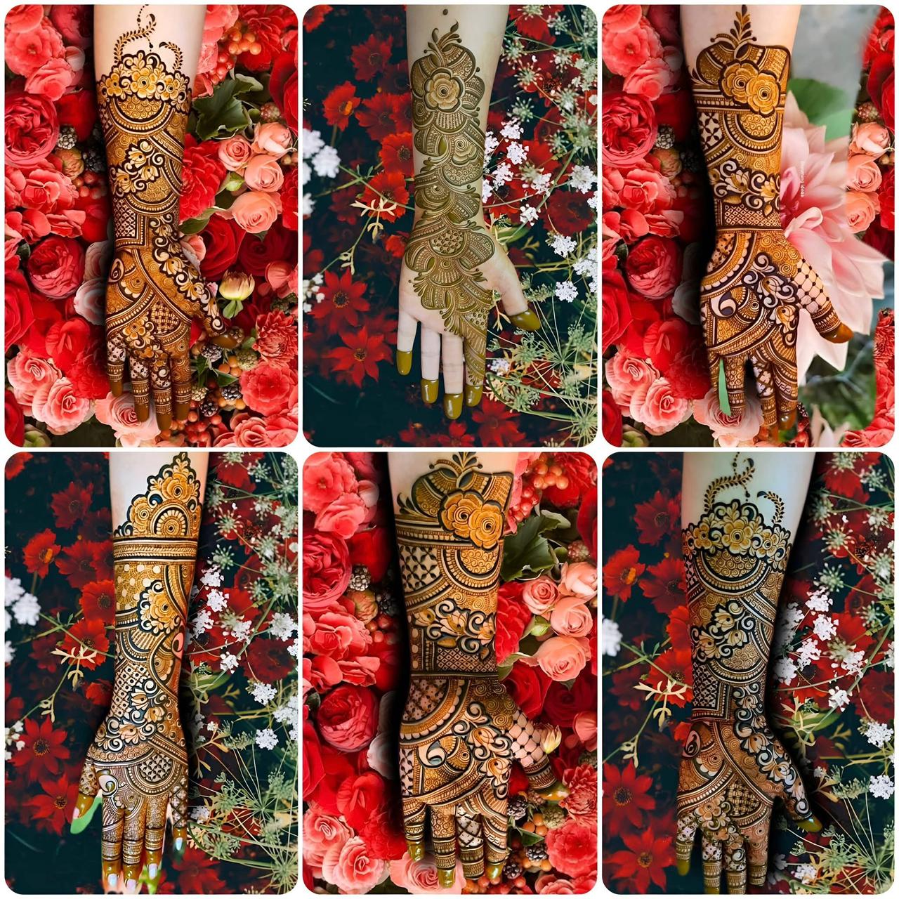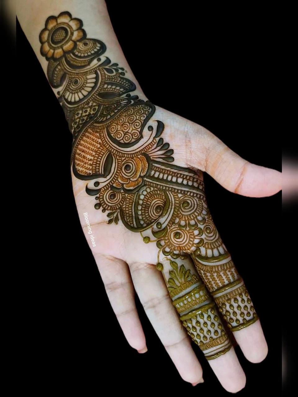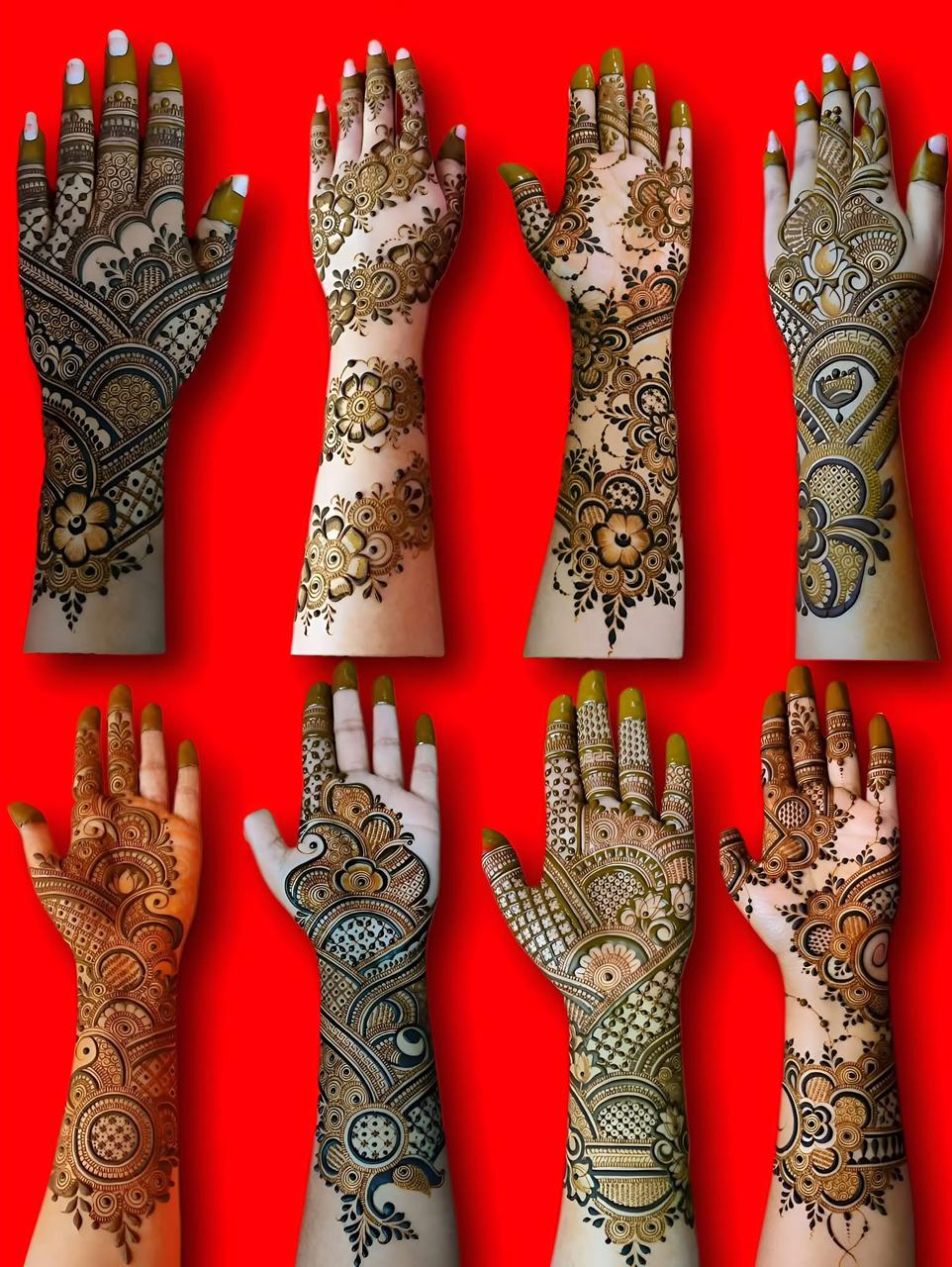 For those who like delicate and subtle designs — minimal floral or geometric patterns, often covering fingertips, wrist-area or partial hand instead of full-hand coverage. Great for lighter occasions or pre-wedding functions.