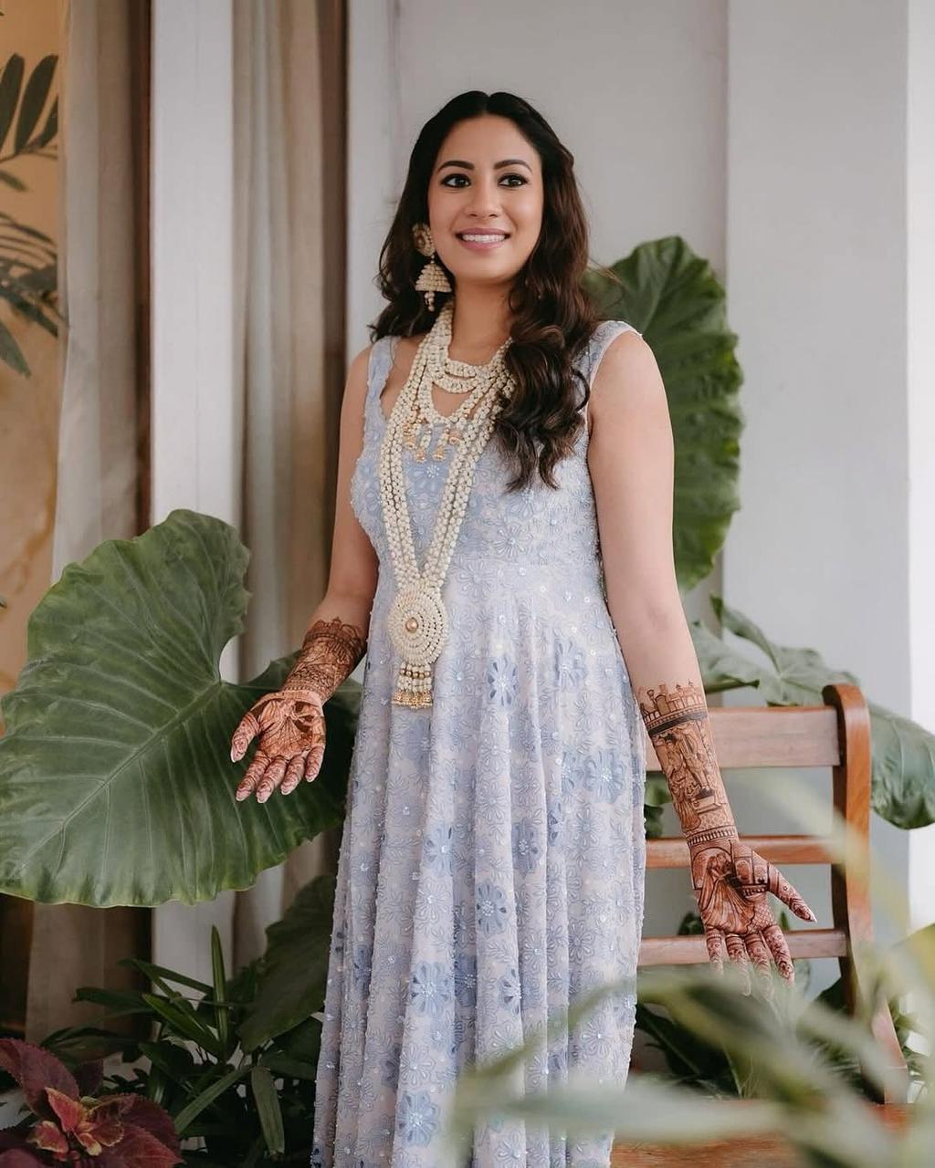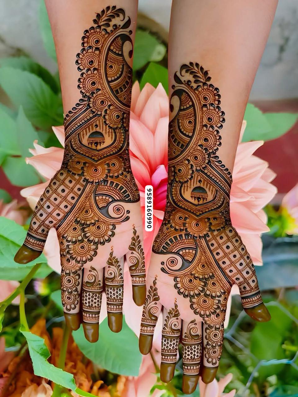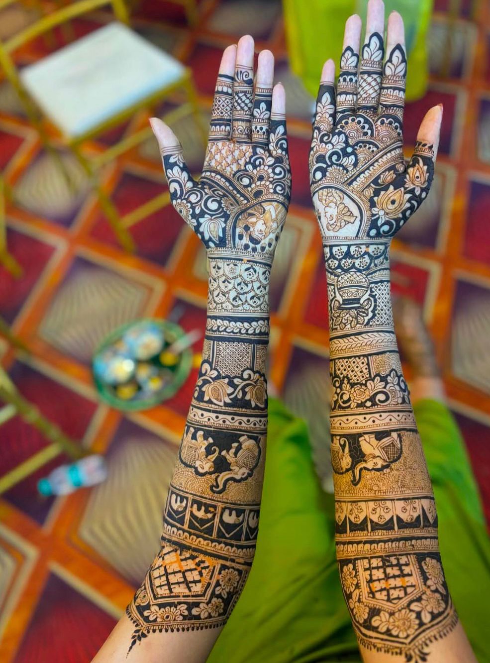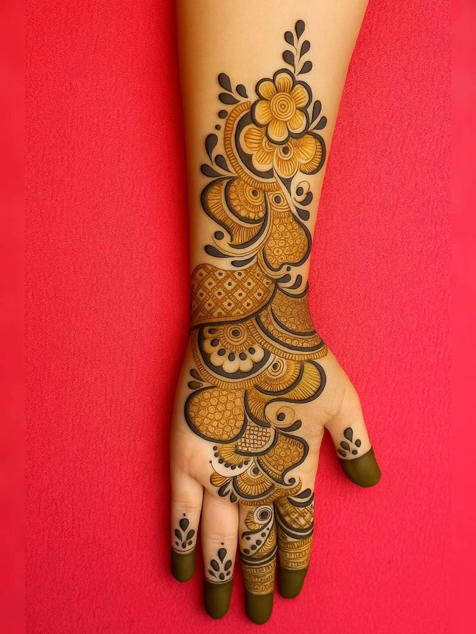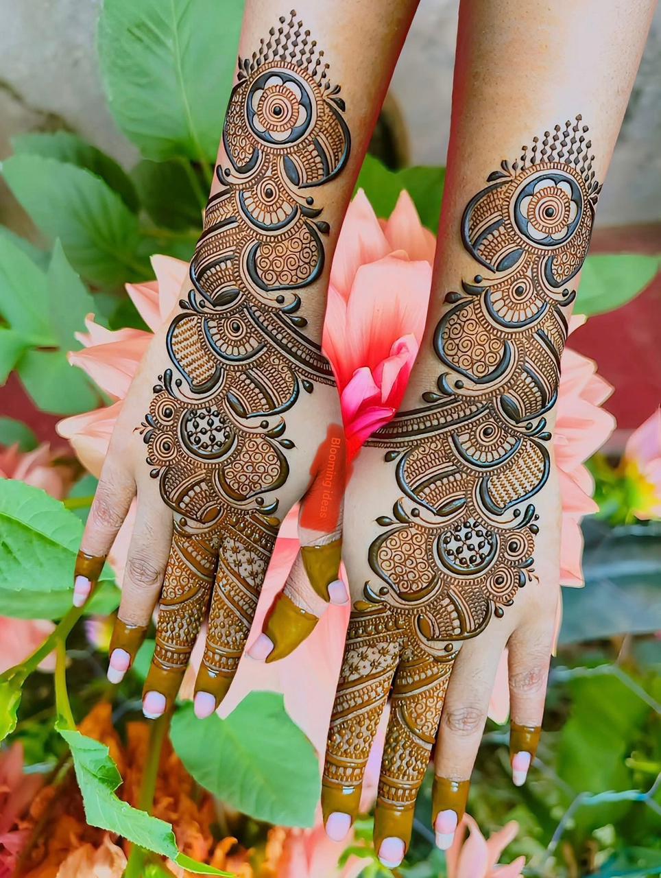 For those who like delicate and subtle designs — minimal floral or geometric patterns, often covering fingertips, wrist-area or partial hand instead of full-hand coverage. Great for lighter occasions or pre-wedding functions.