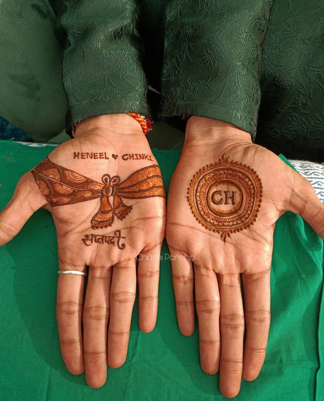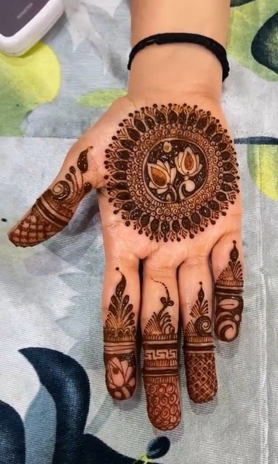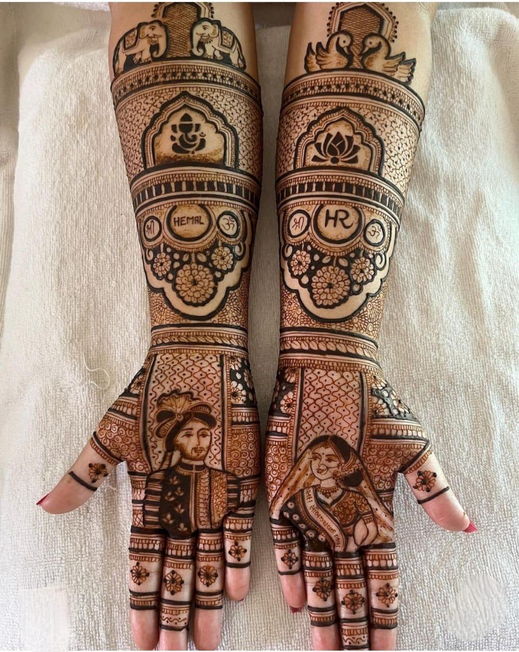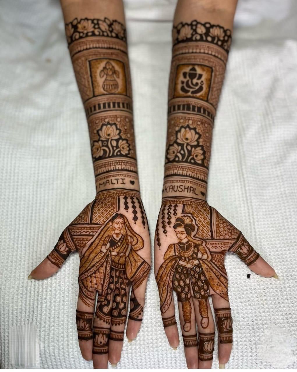 This style includes writing names or initials (of bride & groom) inside the mehndi — usually within a floral/mandala motif or central circle. A popular personal touch for engagement or weddings.