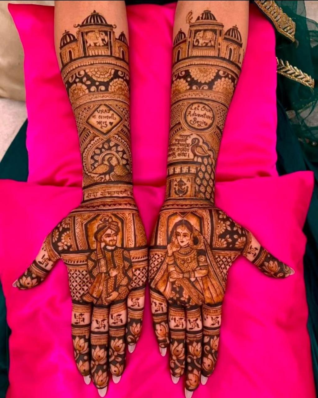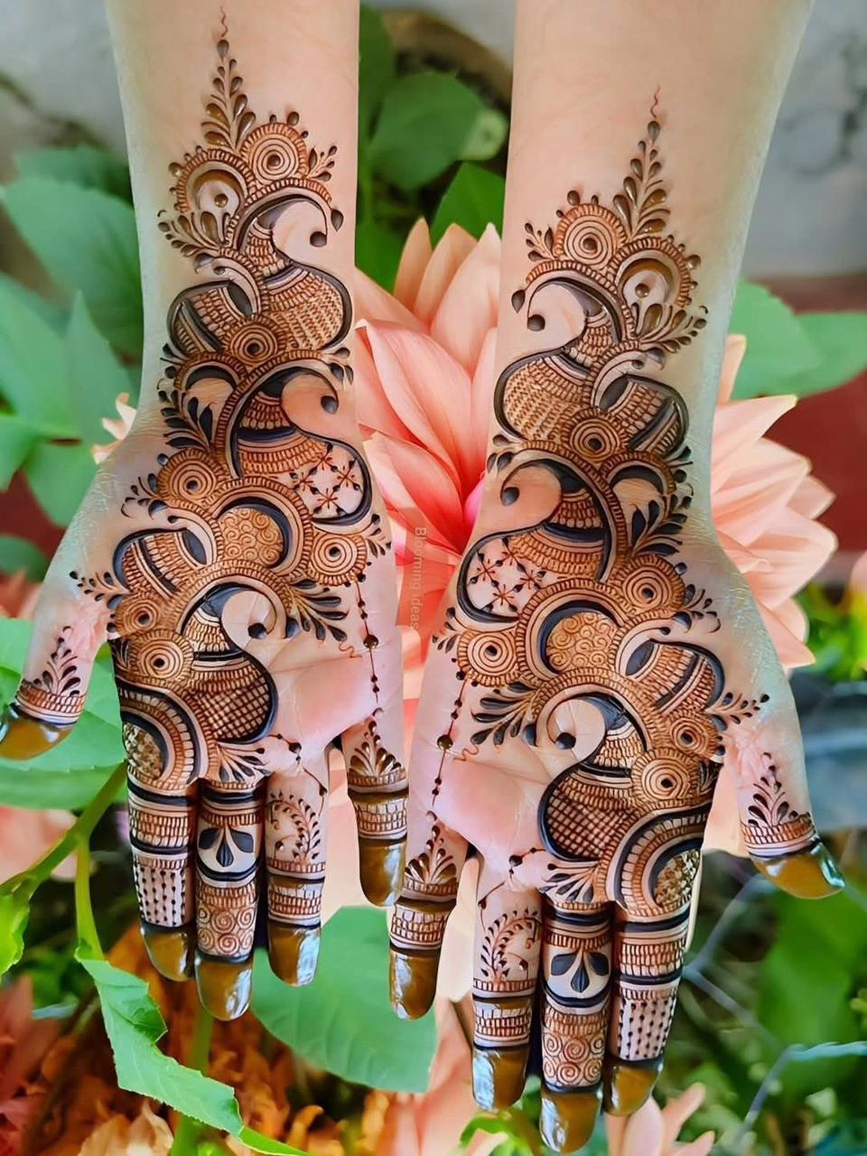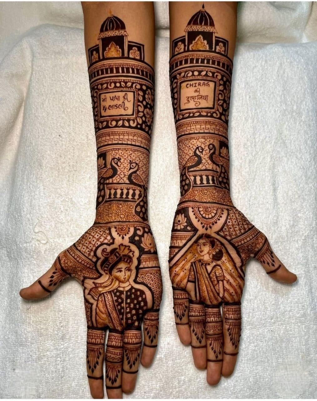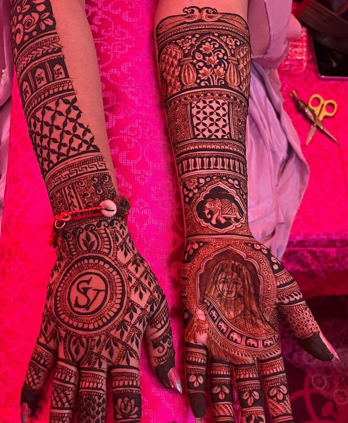 This style includes writing names or initials (of bride & groom) inside the mehndi — usually within a floral/mandala motif or central circle. A popular personal touch for engagement or weddings.